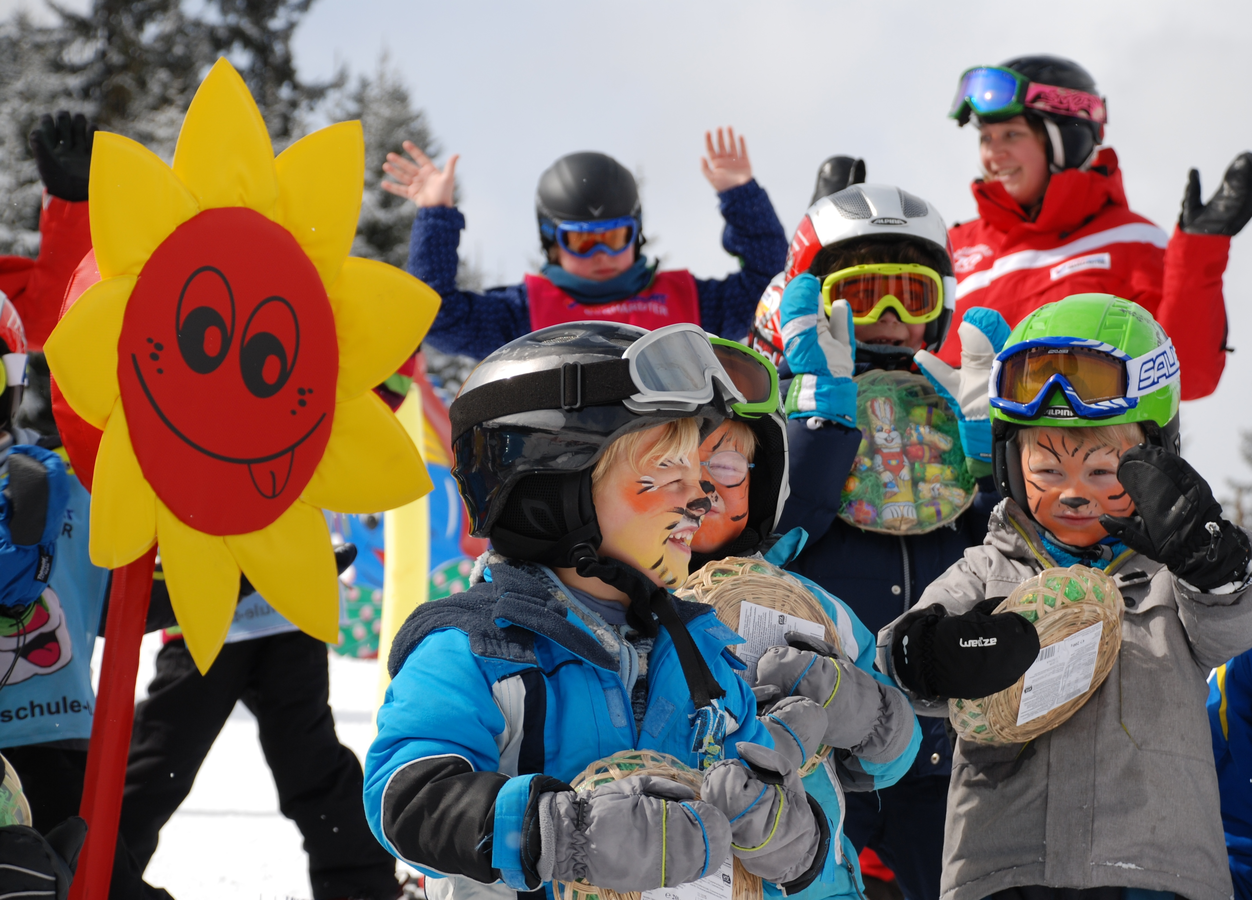 Die Skilehrer-Osterhasen helfen, feuern an und unterstützen bei den Spielstationen und bei der Suche nach den Osternesterln.